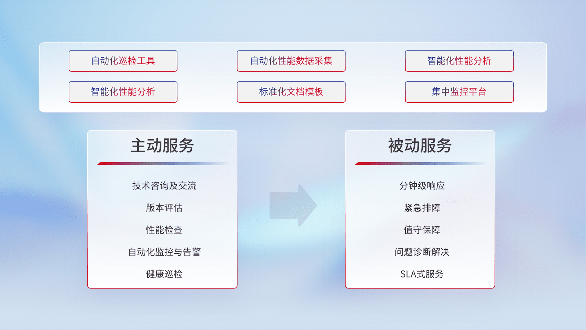 智能化工具和标准化文档,,,,保障服务质量,,提供主动服务(包含技术咨询、、、版本评估、、性能检查、、、、自动化监控与告警、、、、健康巡检)和被动服务包含(分钟级响应、、、紧急排障、、、、值守保障、、、、问题诊断解决、、、、SLA服务)。。。。