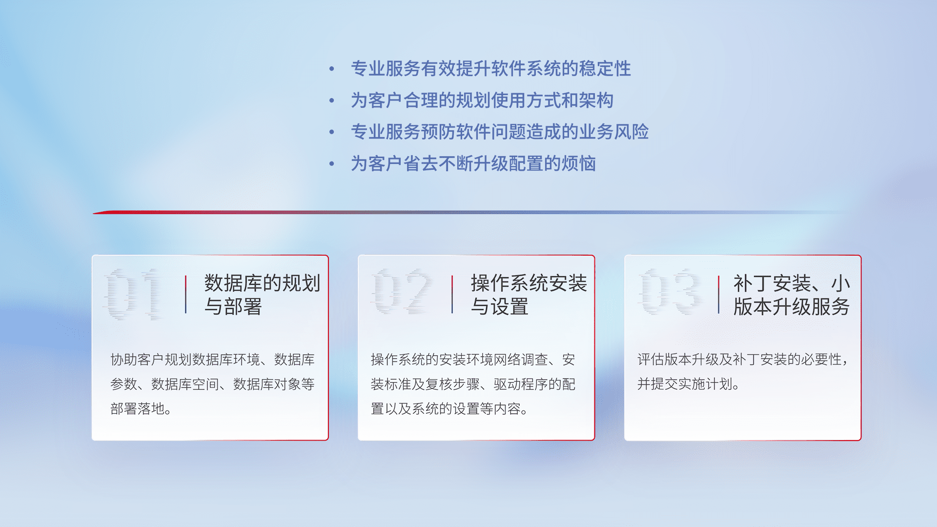 为客户提供软件规模升级、、、快速部署、、、按需配置的专业服务,,,,从数据库的规划与部署到操作系统的安装与设置,,,再到补丁安装和小版本升级提供支持。。。